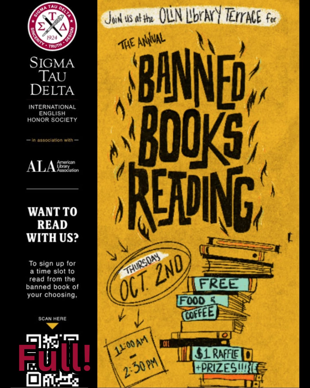 Stop by anytime between 11:00 AM and 2:30 PM to enjoy short readings from banned and challenged books. With all time slots filled, there are three-and-a-half hours of compelling literature lined up! The event will take place on the Olin Terrace, just outside the library. In the unlikely event of inclement weather, the event will move inside to Sunderland Lyceum. Check for updates Thursday morning if needed.