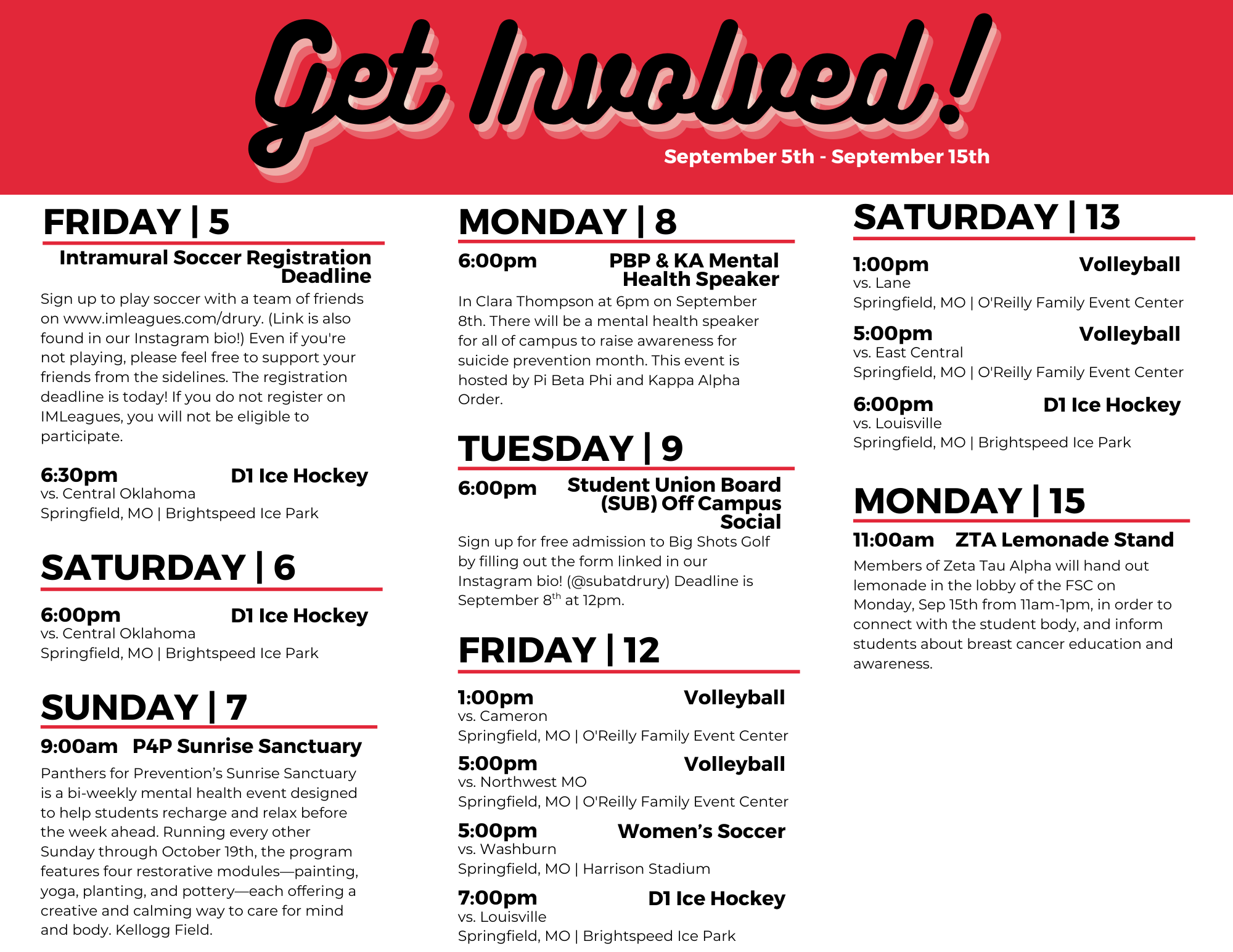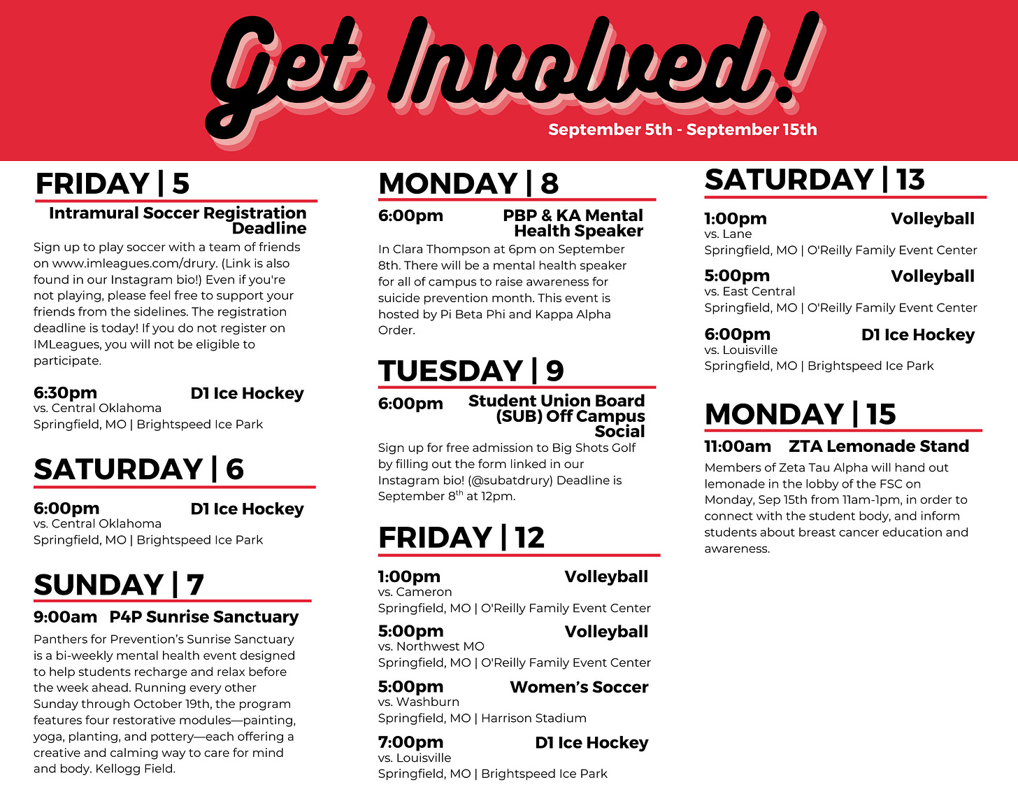 Get Involved! 9/5-9/15Here is what's happening on campus this week:Your Friends at DrurySep 08, 2025SharePreviousNext